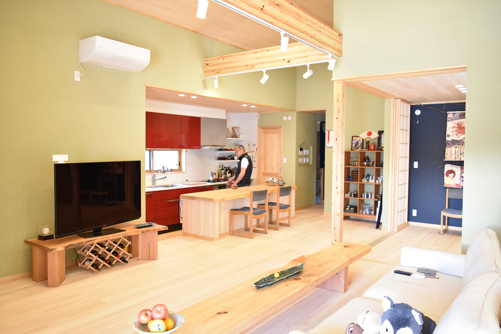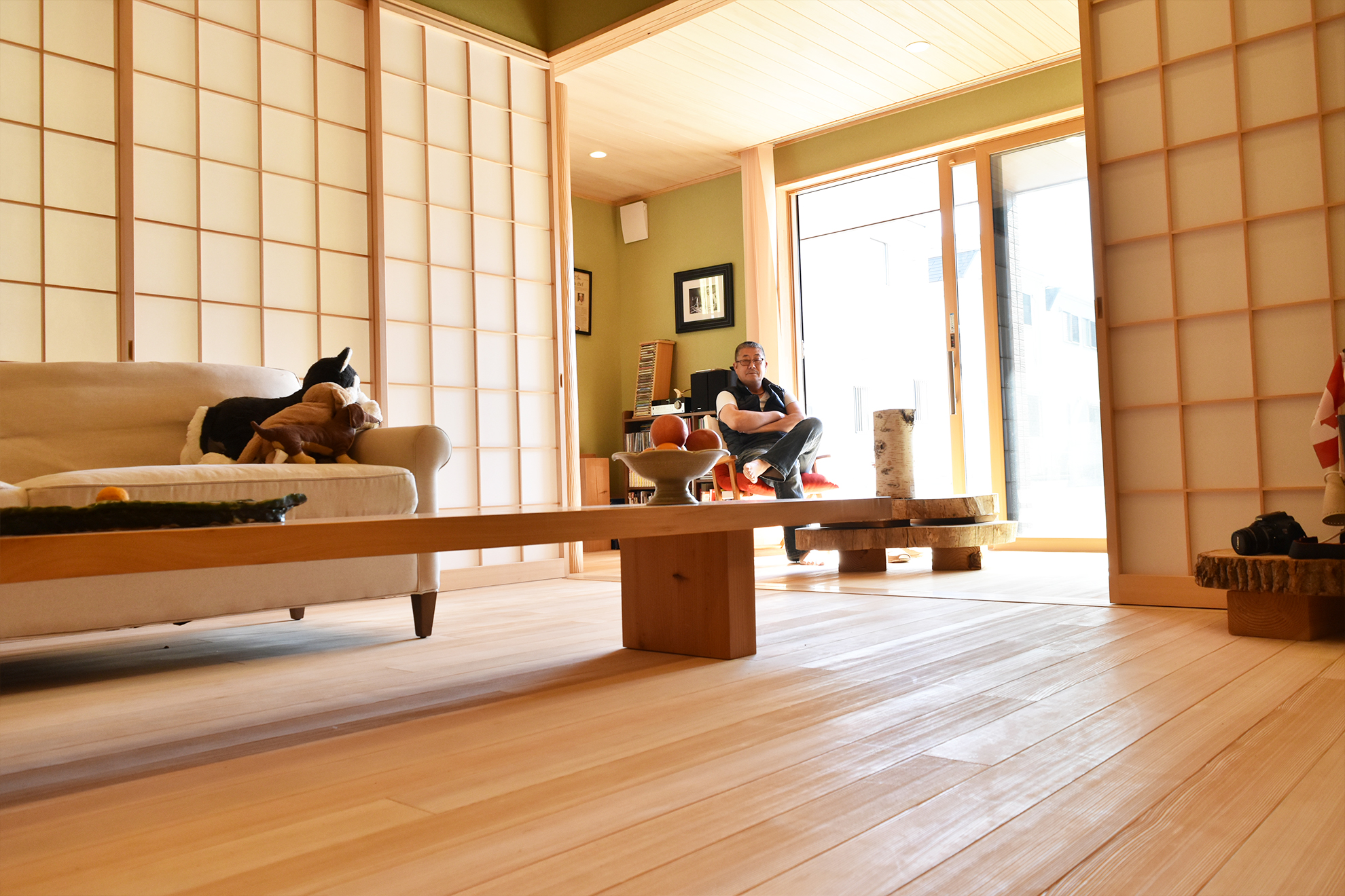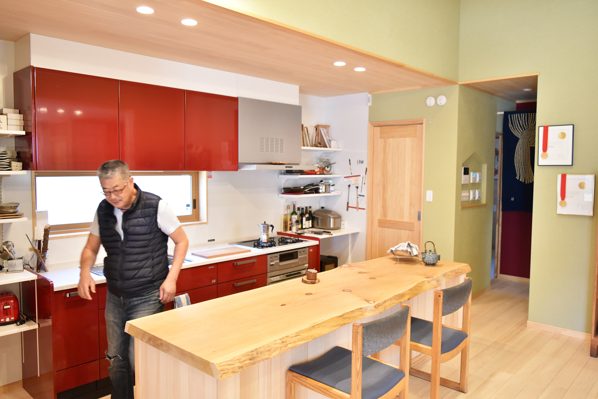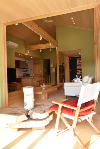 | ご提案内容 | 日本とカナダを行き来する2拠点生活をされているY様。 日本の暮らしに馴染むような広い土地に平屋の和風住宅を建てて内装材には無垢材を使用したいとのことでしたので、もみの木の素材をご提案したところ大変気に入って頂け、床と天井全面にご採用いただきました。 ご友人に料理を振る舞うため、カウンター材やテーブル材はY様と一緒に材木店に出向きご自身で選ばれた1枚板を使用しております。 住まわれた後にお伺いしてお話を伺うと、天気の良い日は縁側でゆっくり過ごすのがとても気持ちいいというお話を笑顔でされておりました。 |