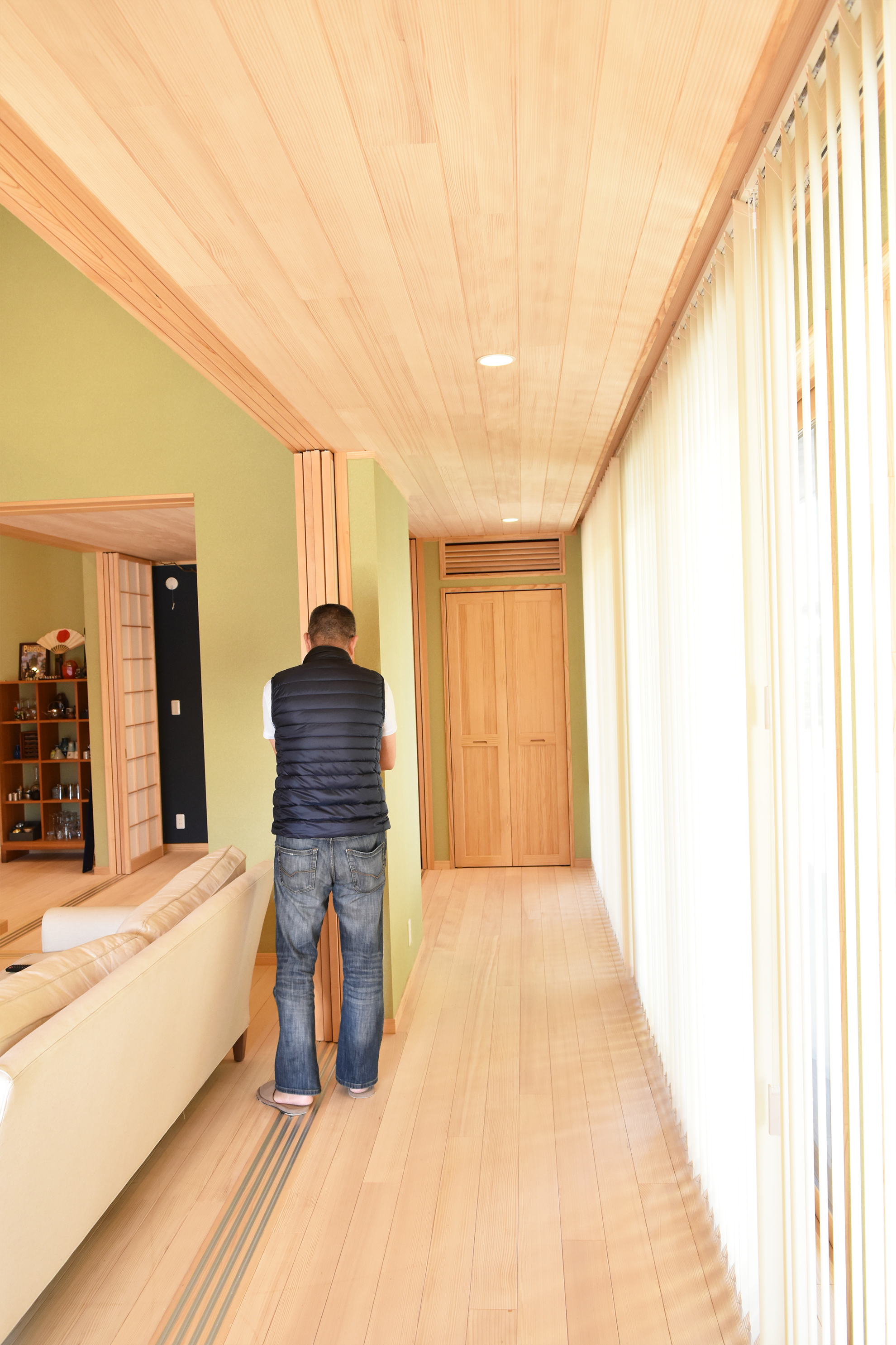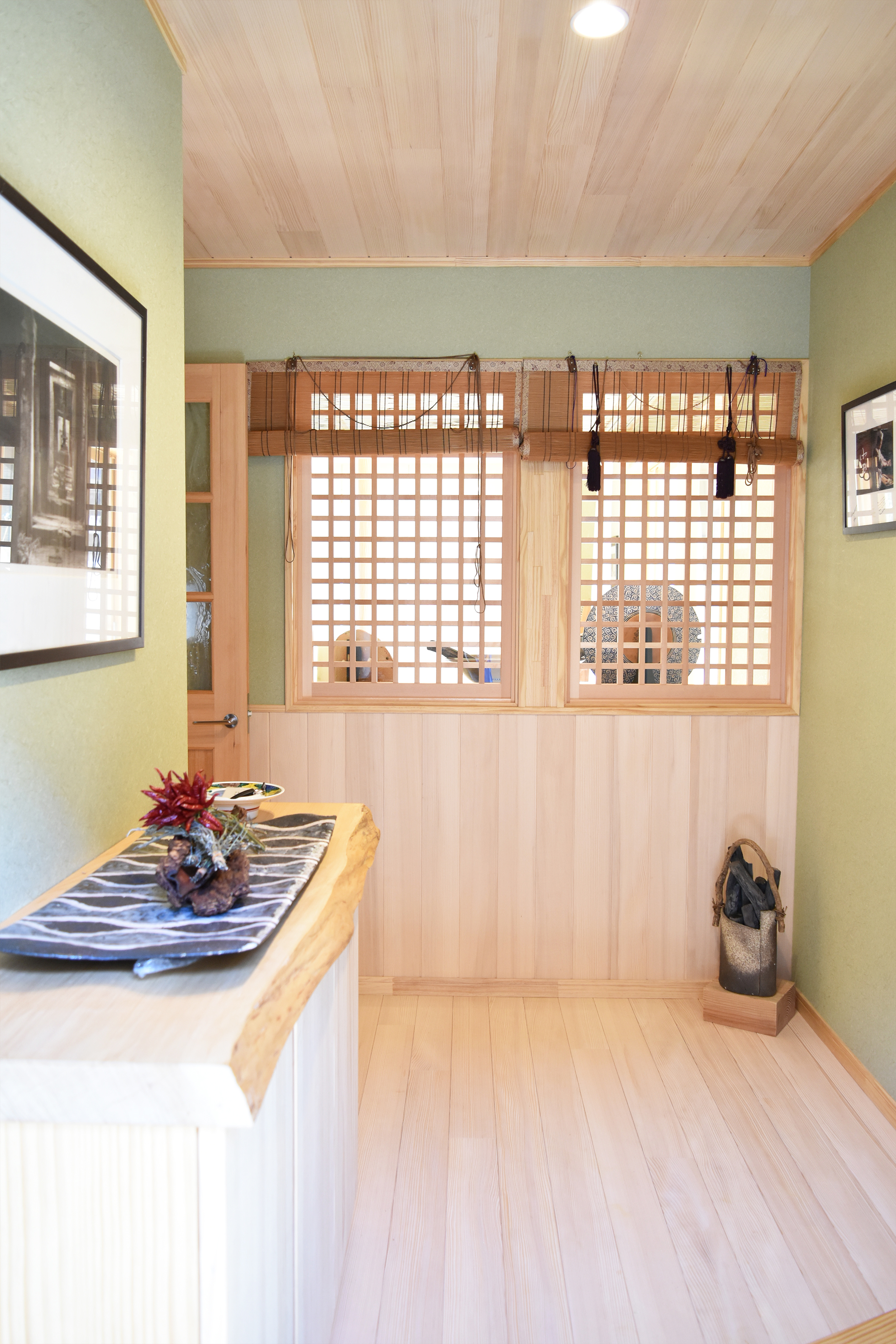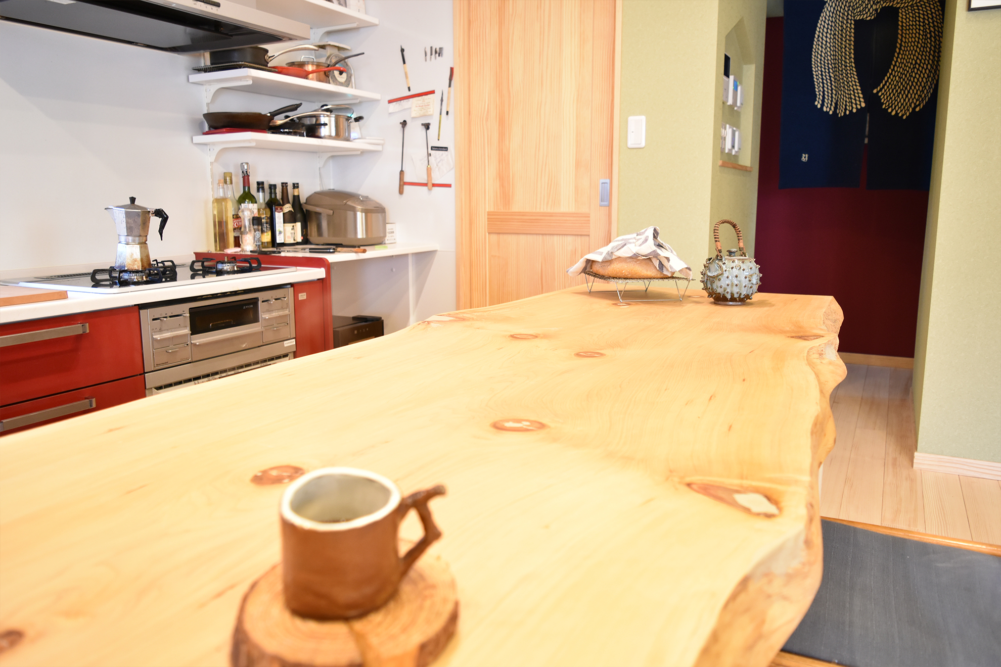 | ご提案内容 | 日本とカナダを行き来する2拠点生活をされているY様。 日本の暮らしに馴染むような広い土地に平屋の和風住宅を建てて内装材には無垢材を使用したいとのことでしたので、もみの木の素材をご提案したところ大変気に入って頂け、床と天井全面にご採用いただきました。 ご友人に料理を振る舞うため、カウンター材やテーブル材はY様と一緒に材木店に出向きご自身で選ばれた1枚板を使用しております。 住まわれた後にお伺いしてお話を伺うと、天気の良い日は縁側でゆっくり過ごすのがとても気持ちいいというお話を笑顔でされておりました。 |